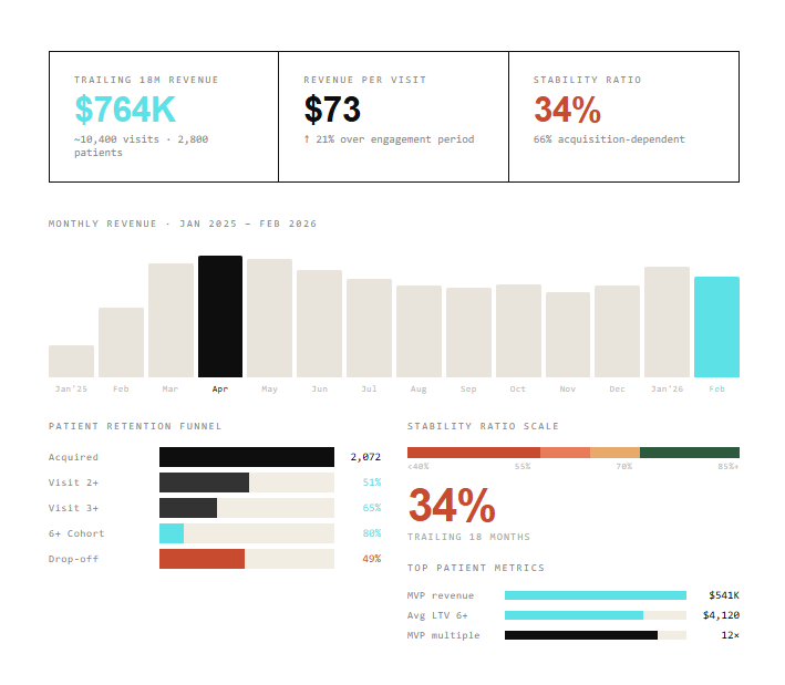 Most founders know some patients come back. They don't know which ones, how many, what they're worth, or what it would mean to improve retention by ten percentage points.