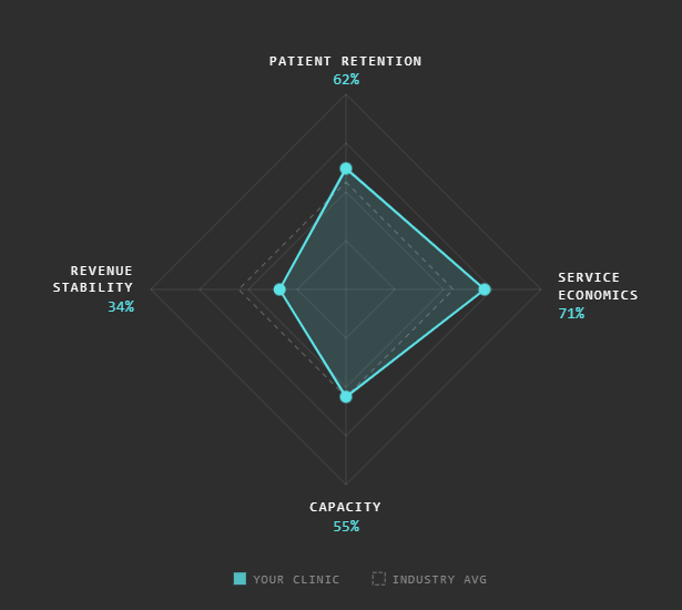 The diagnostic maps the economics of your existing patient base across four dimensions: